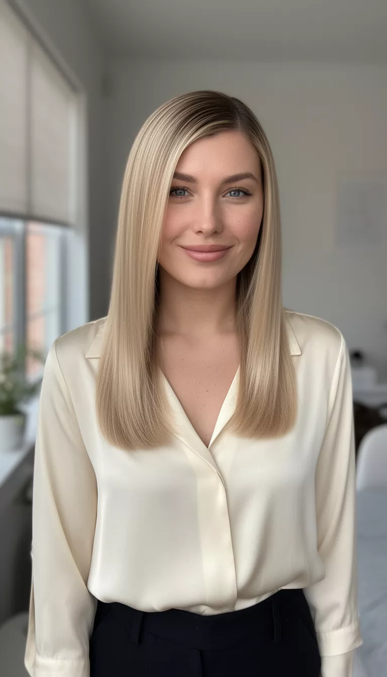 Champagne blonde with a soft shadow root offers an elegant pale beige tone that makes fine hair appear much thicker.