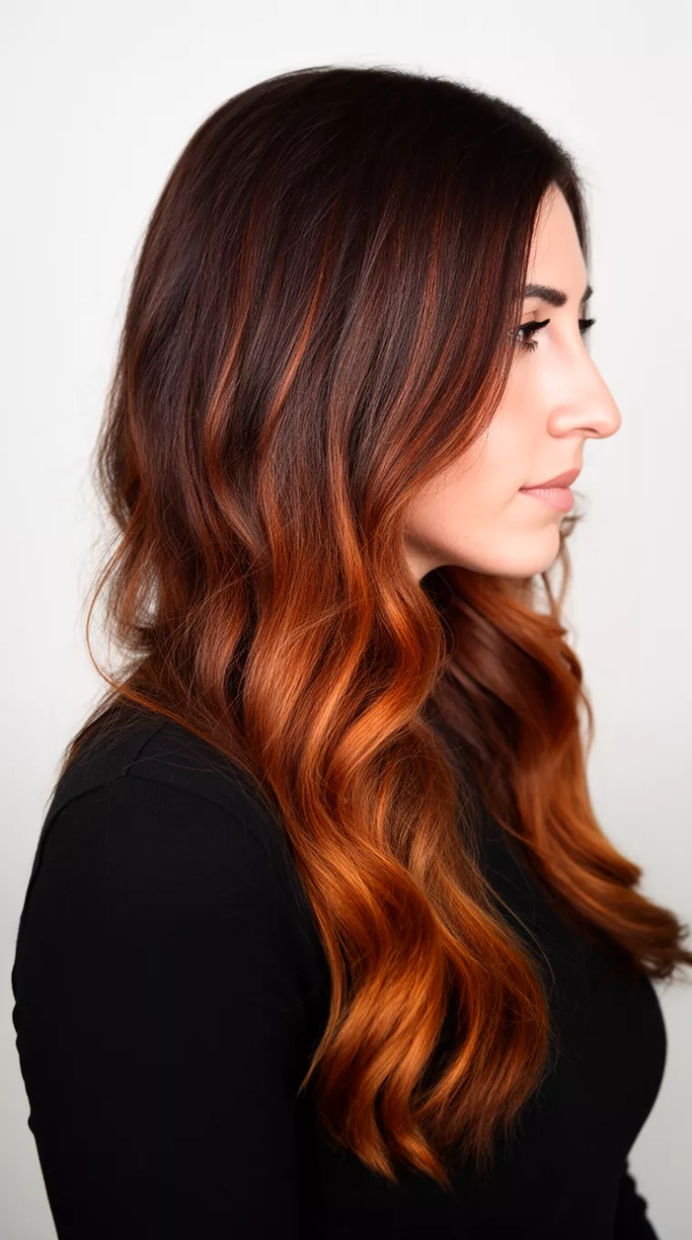 Warm auburn ombré highlights provide a beautiful gradient from dark roots to spicy ends.