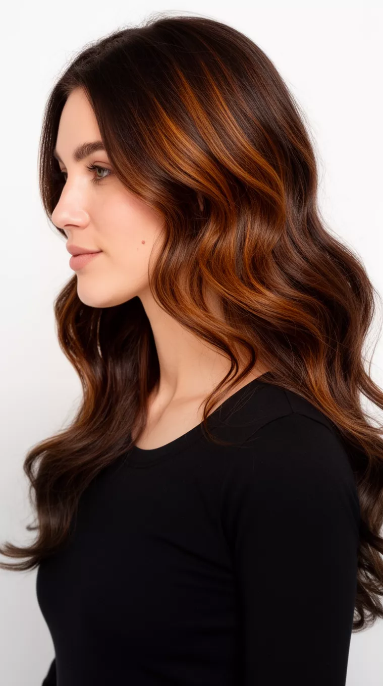 These warm copper highlights provide a metallic sheen to dark brown hair that looks expensive and polished.