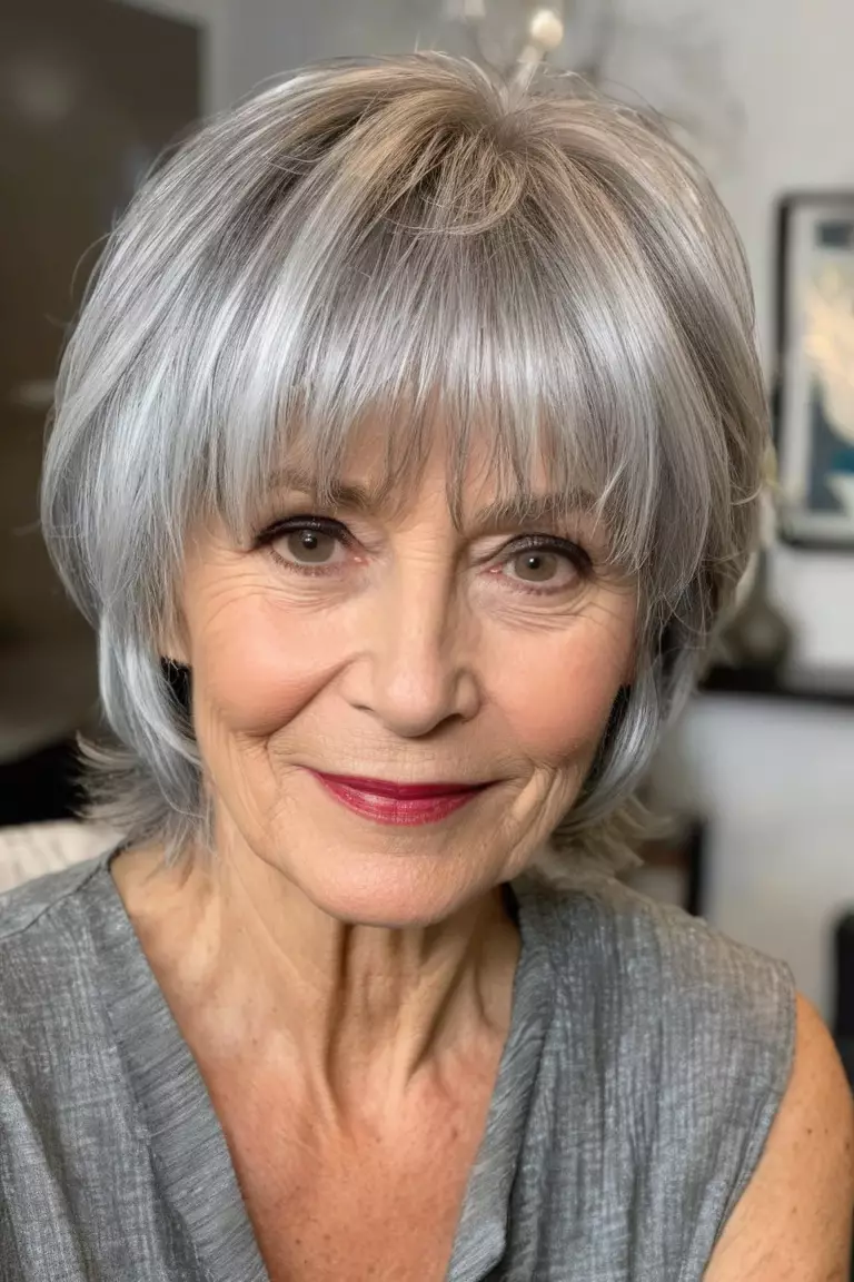 A silver bob featuring soft layers and gentle bangs offers a delicate frame for your face.