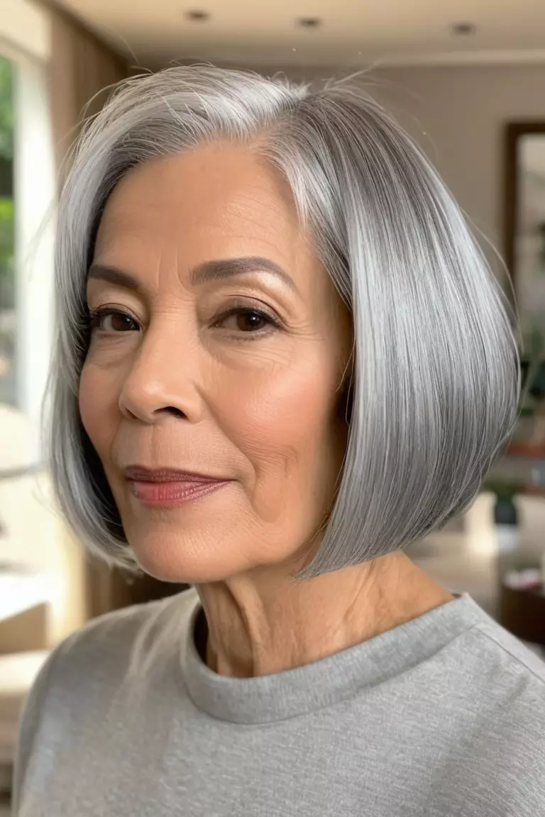 It’s a chic, easy-to-manage bob that highlights your silver tones beautifully.