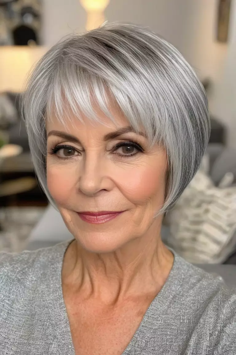 Showcase your straight, fine hair with a sleek silver pixie bob.