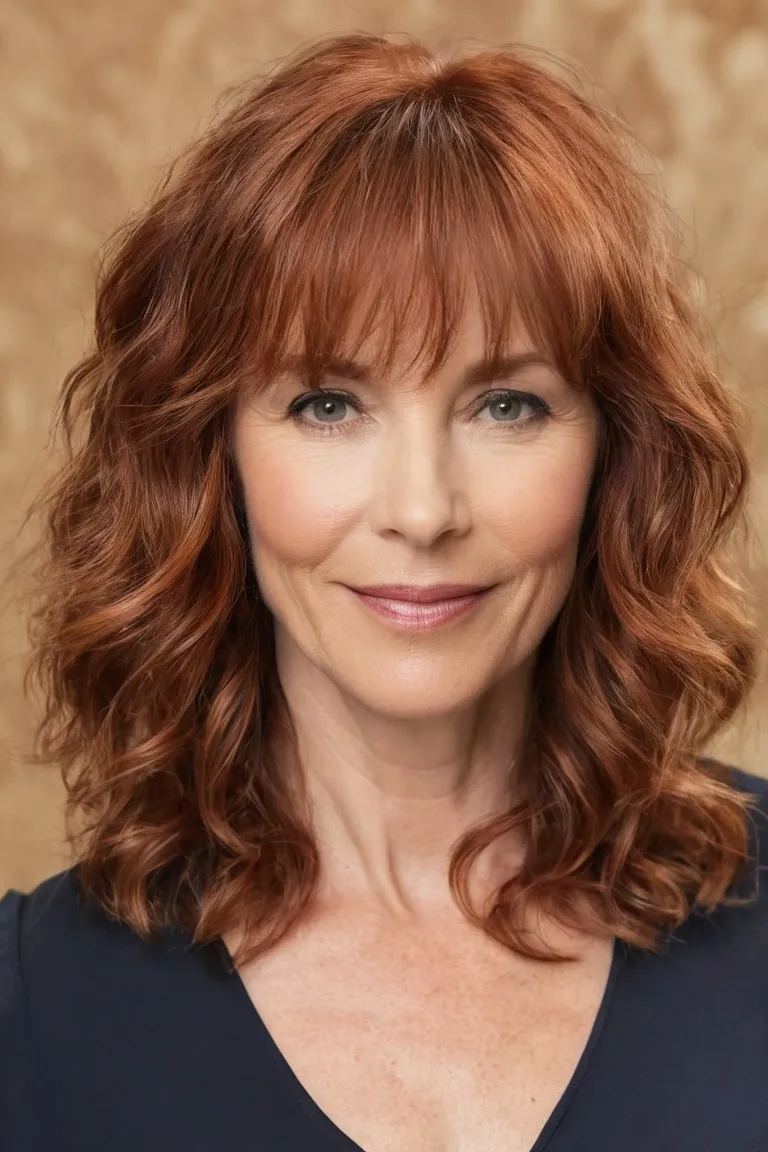 Auburn waves add warmth to your complexion, while wispy bangs frame your face beautifully.
