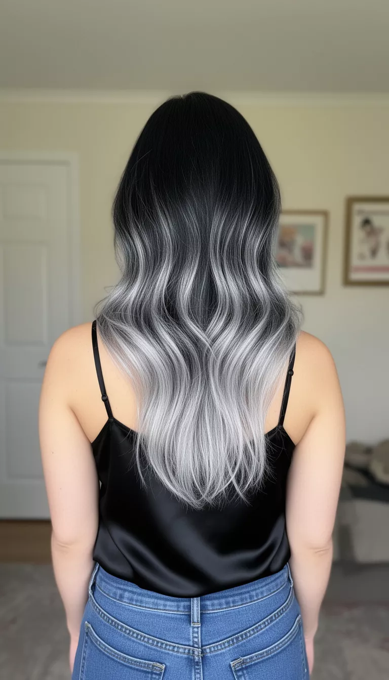 Black to silver ombre creates a dramatic gradient that shifts from jet black roots to shimmering metallic silver tips.