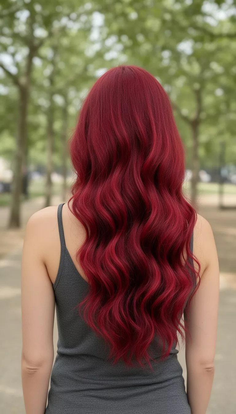 Ruby red vibrancy is a vivid, high-saturation shade that often features dark roots for added depth.