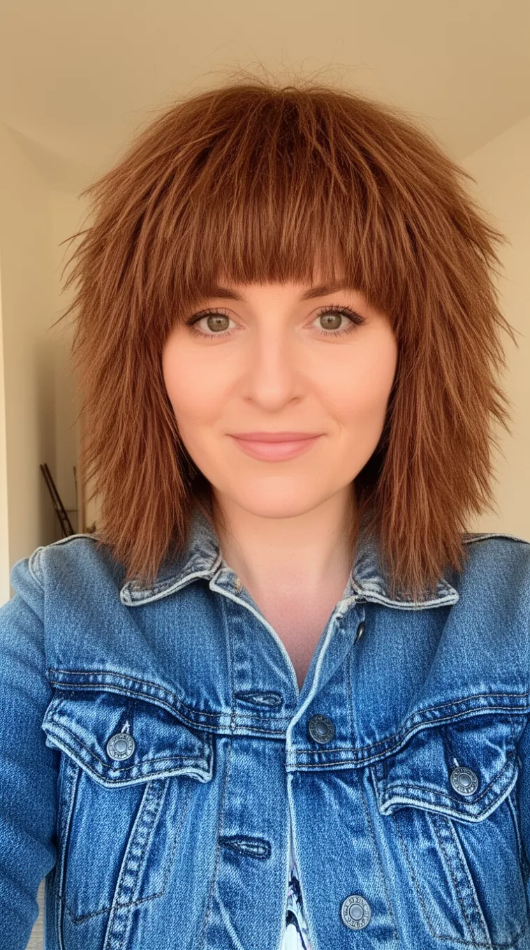 The straight-across blunt fringe creates a playful contrast against the choppy layers.