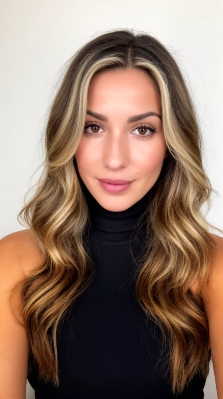 Golden Sandstone Highlights involve thin, golden blonde streaks woven through a medium brown base to create a sparkling finish.